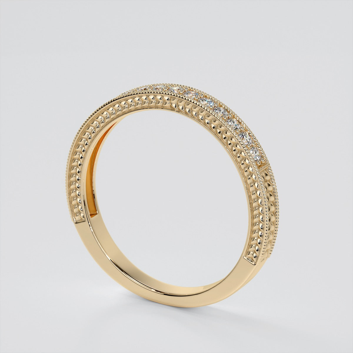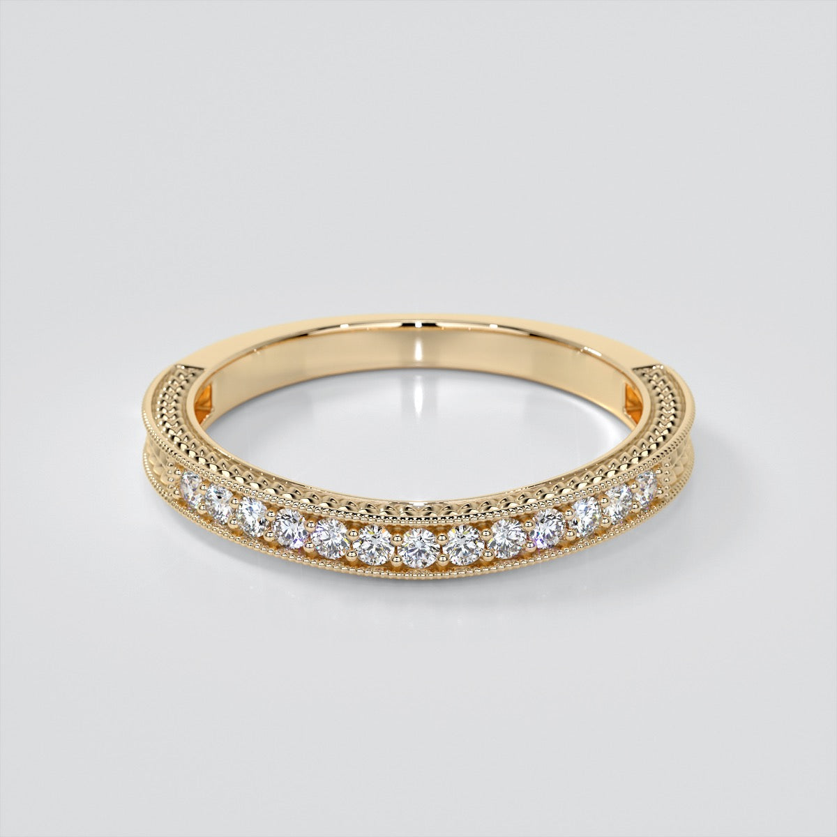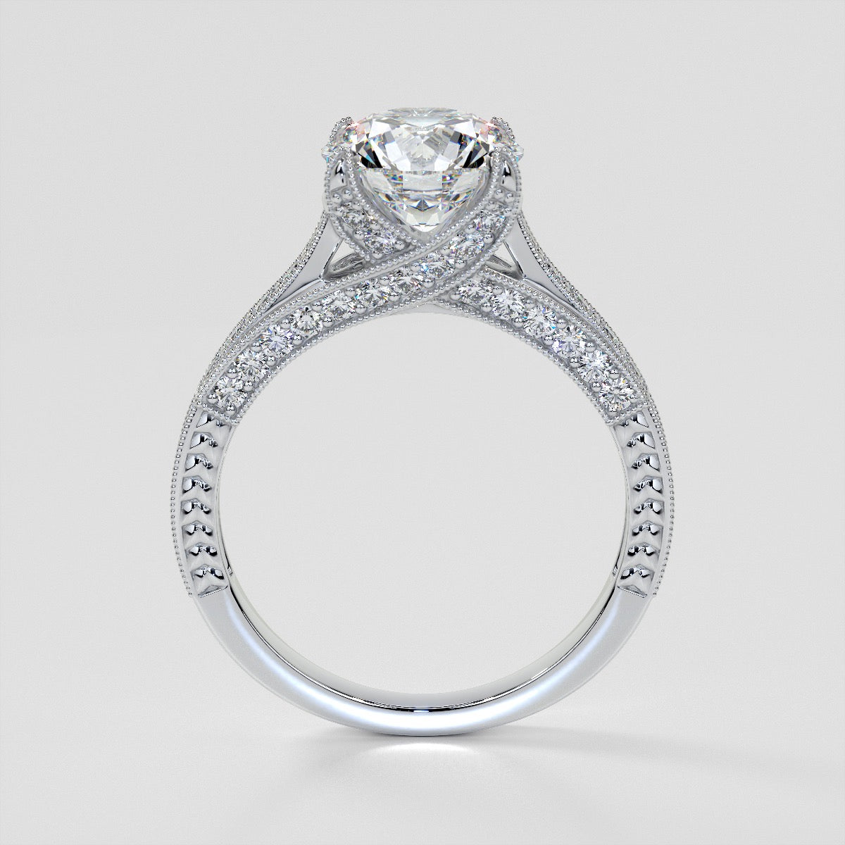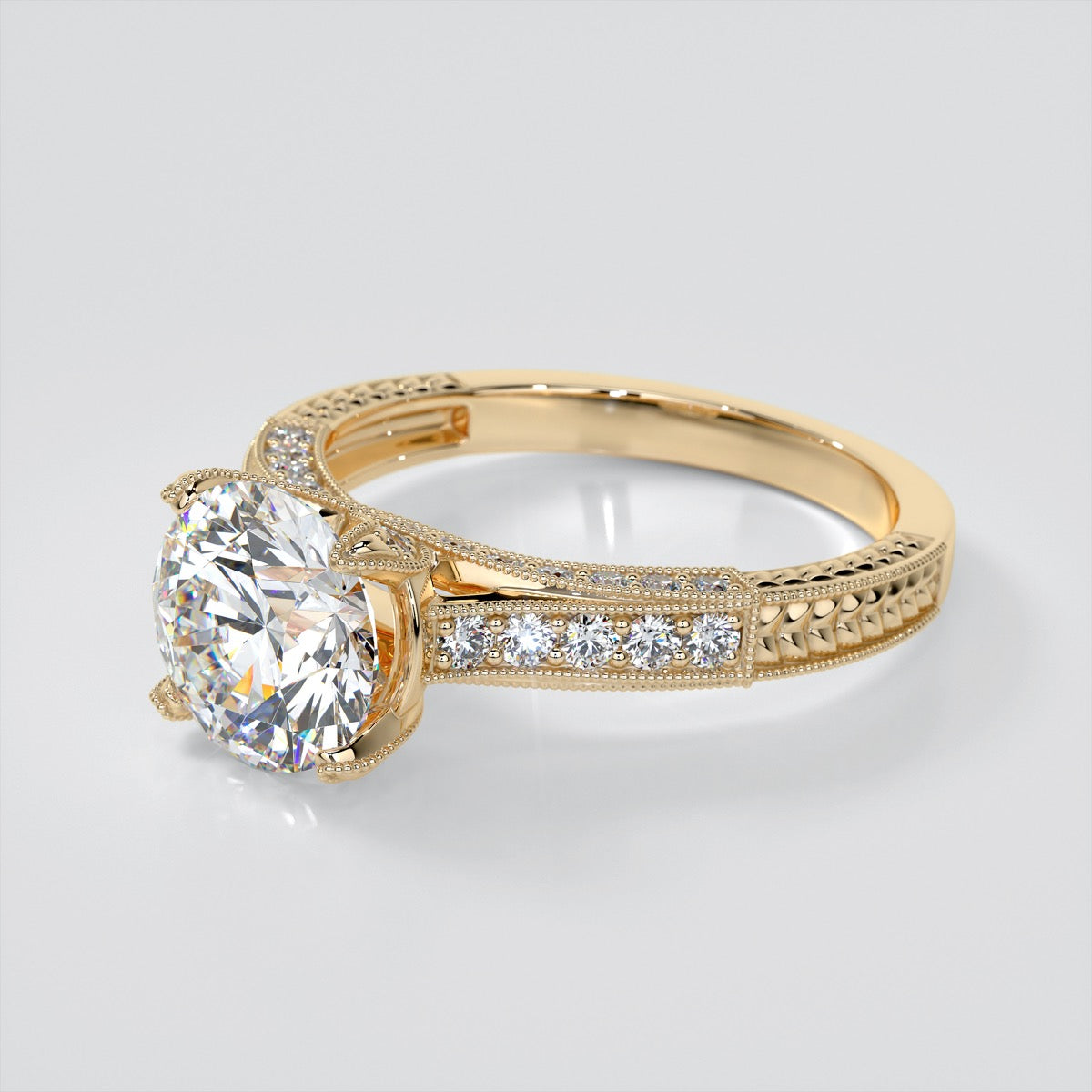 Elegant in its simplicity, this Antique-Style Round Cut Engagement Ring is crafted in a beautifully beaded milgrain frame with engraving throughout.