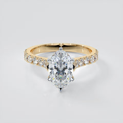 Bold and stylish, this alluring cathedral style engagement ring is certainly awe-inspiring. A magnificent oval cut center stone is framed by an exceptional six-prong setting and perfectly complimented by a cascade of lush pavé-style accents that gracefully flow down the shank creating a glamorous look that she will cherish forever.