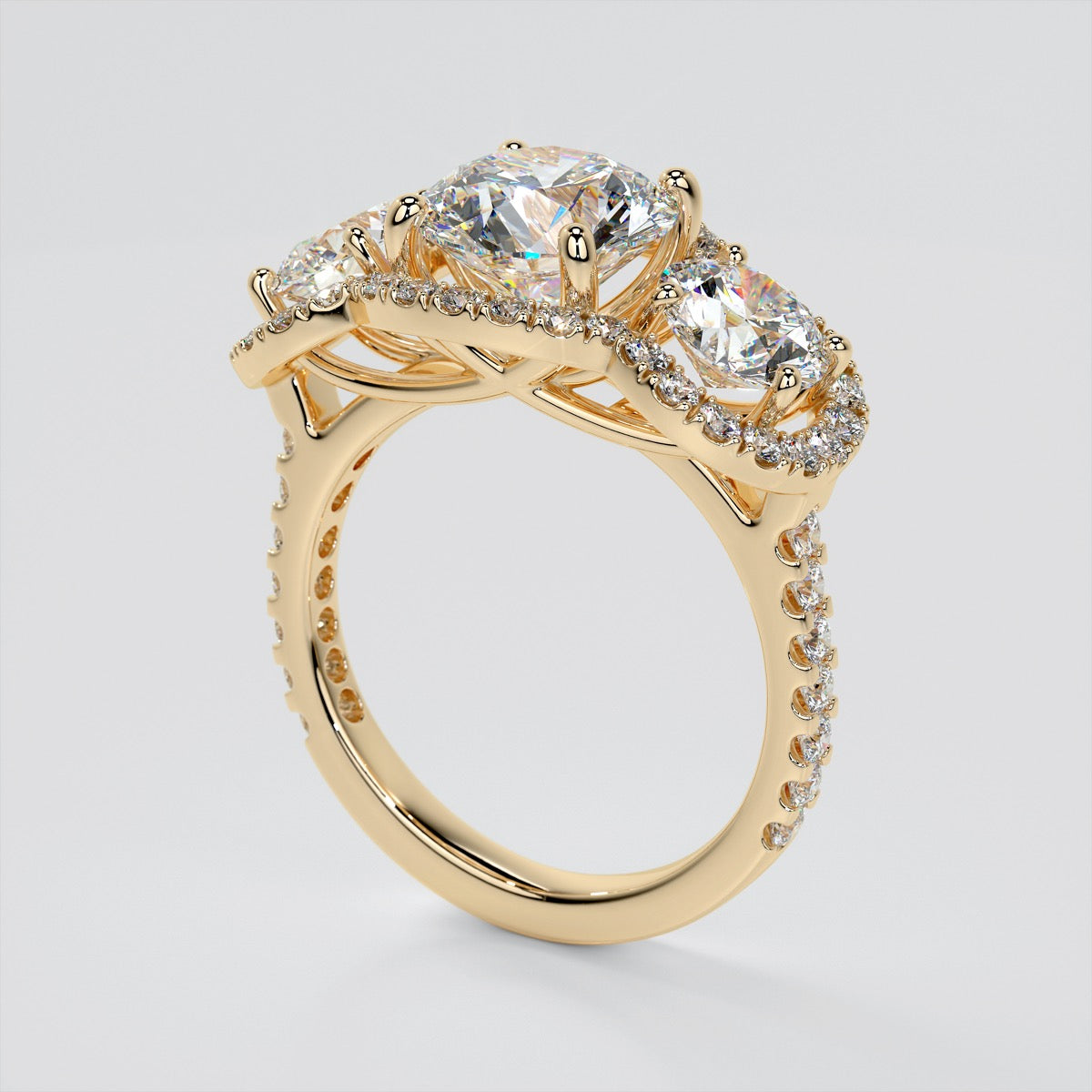 • Round Cut 3-Stone Trellis Engagement Ring with Accents
