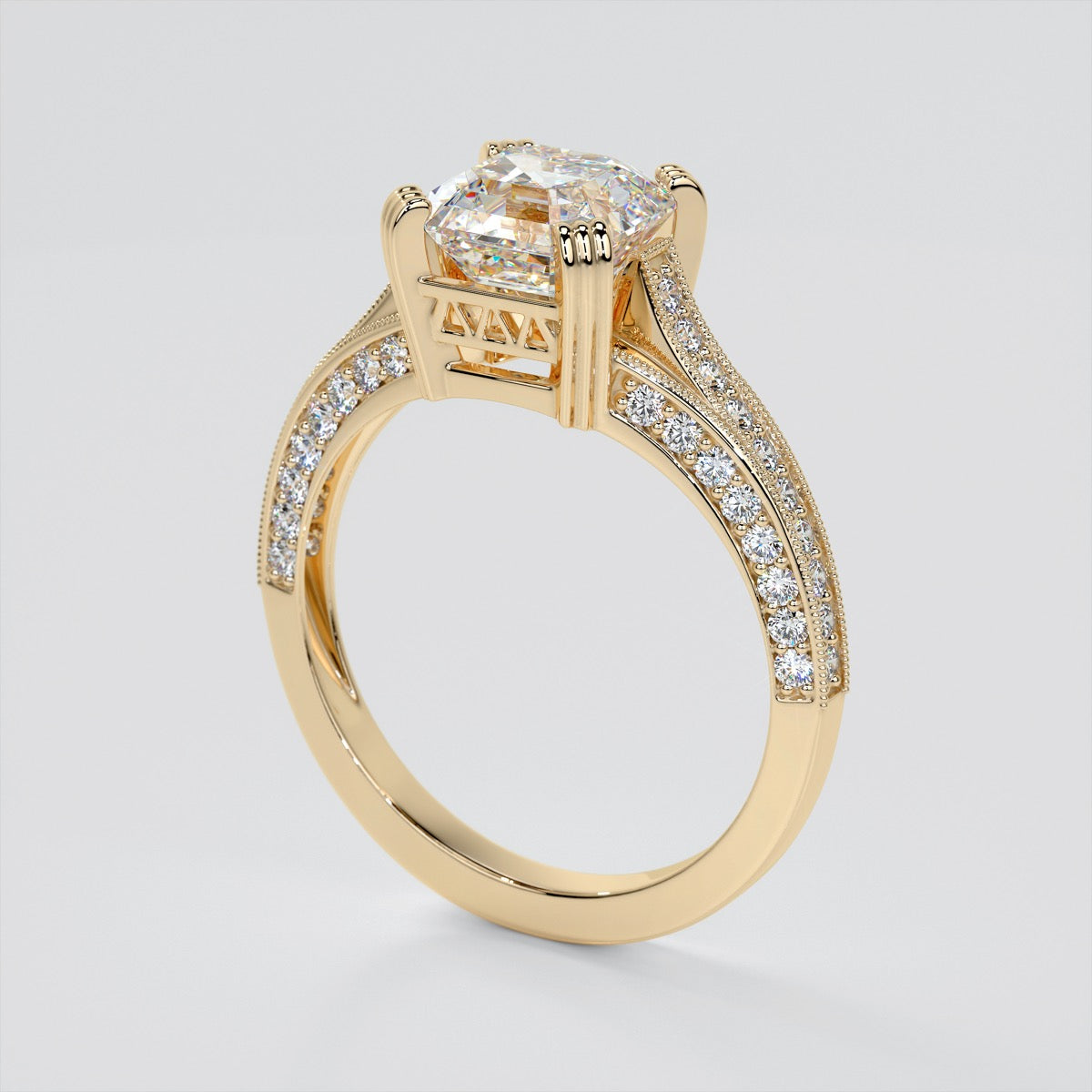 Gracefully embellished by shimmering stones on all three sides, the 2.0Ct Asscher cut center stone is magnificently held up by a crown-designed basket giving this ring an extraordinary style with a traditional feel.