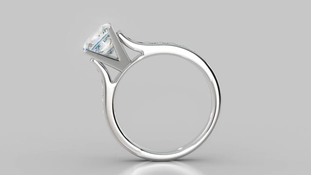 Take her breath away with this timeless cathedral style engagement ring. Features a stunning princess cut center framed by a superb V-style prong setting, the magnificent silhouette of the band is adorned by shimmering round cut accents that cascade down the cathedral shoulders to create a glamorous look she will fall in love with.