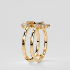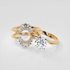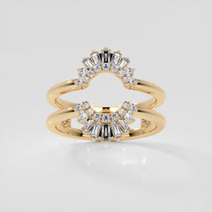 This women's vintage-style enhancer band features brilliant round and baguette cut diamonds that adorn shimmering contoured bands above and below the center. Fashioned from 14K gold, the ring has a total diamond weight of 1/2 carat and is designed to wrap around your diamond engagement ring (sold separately), adding timeless elegance to your existing ring.