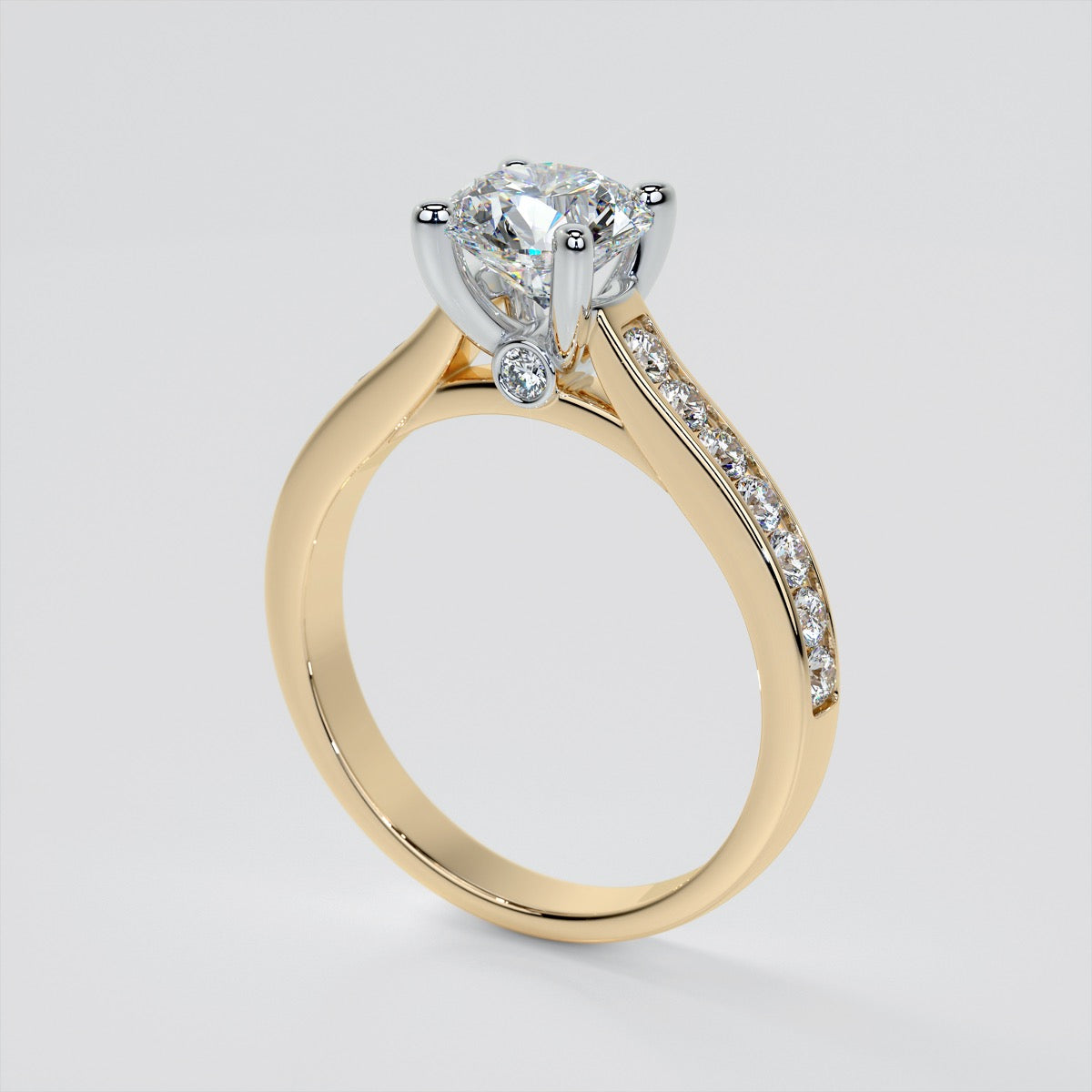 Your love runs deep with this exquisitely modern round cut trio of rings. Luminous channel set stones draw attention to the brilliant solitaire featuring a radiant round accent set into the bezel of the cathedral prong setting as matching bands beautifully surround the enagement ring completing a wedding set she will cherish forever.