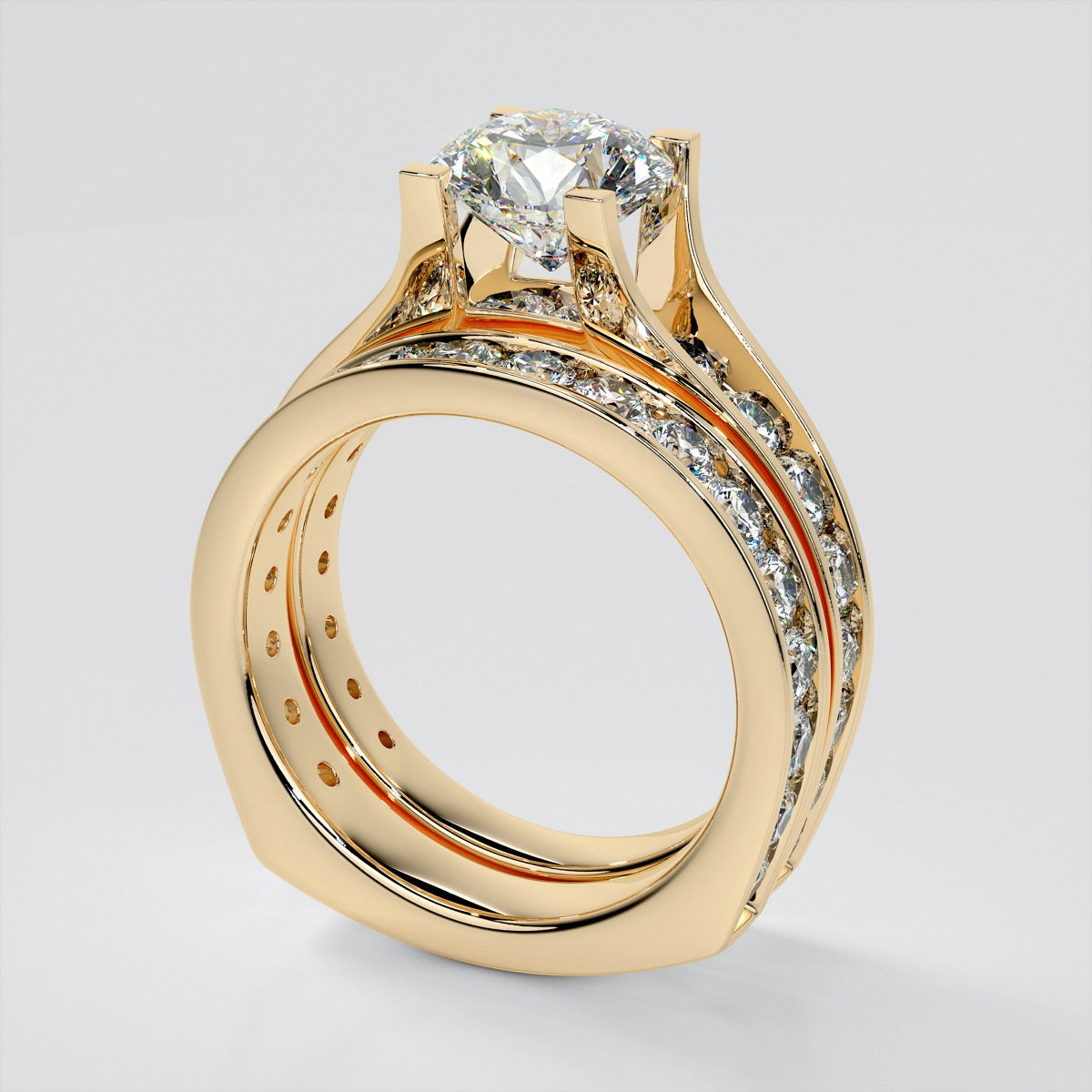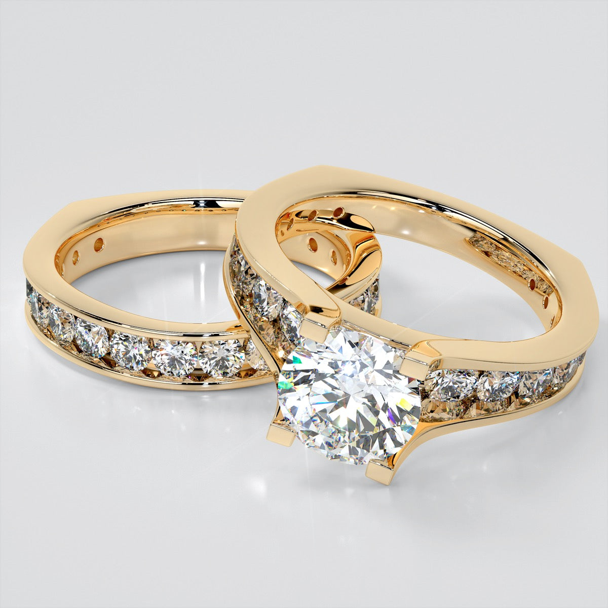 Exclusively crafted with her in mind, this bridge style trio of rings is truly unique. Two shimmering channel set bands sit perfectly flush and exquisitely contour around a stunning Round cut engagement ring featuring tension set prongs and euro shanks for a comfortable fit she will fall in love with.