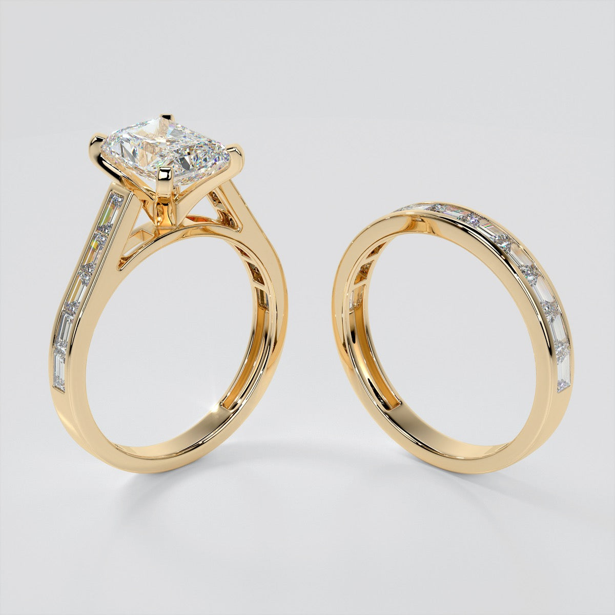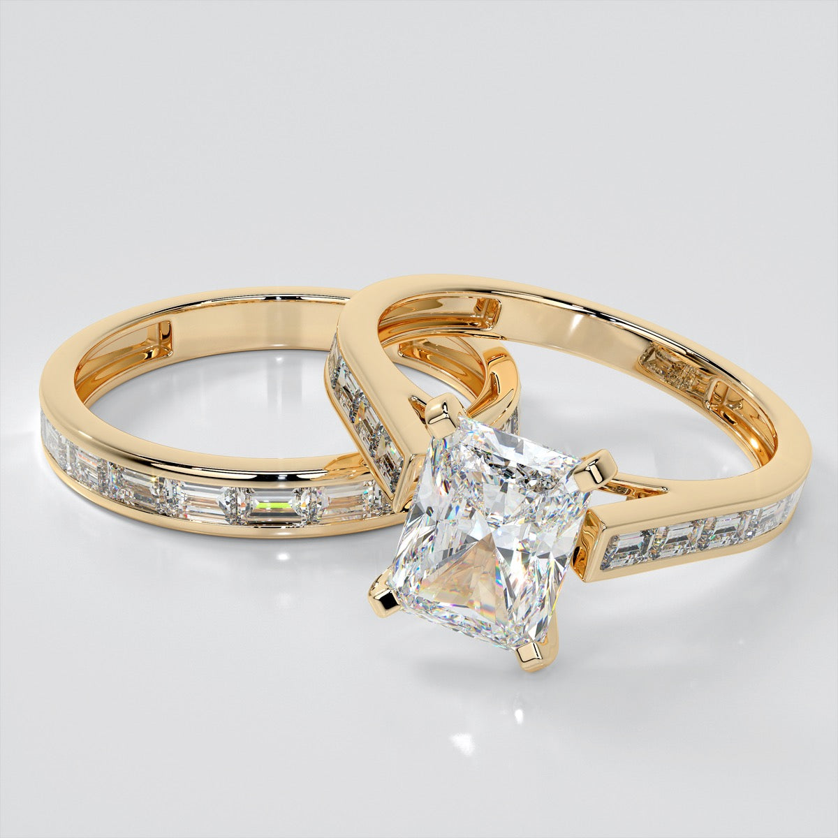 With stylish elegance this Radiant Cut wedding set is the perfect pair for your special day. A stunning Radiant Cut engagement ring joined by a marvelous sleek band of baguettes beautifully symbolizes your love and commitment.